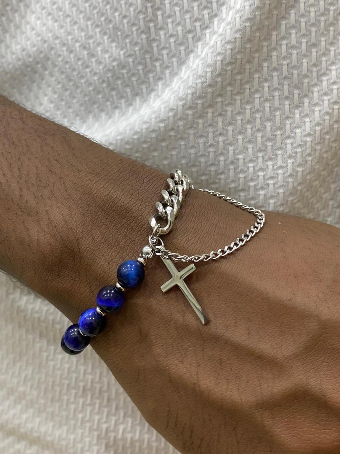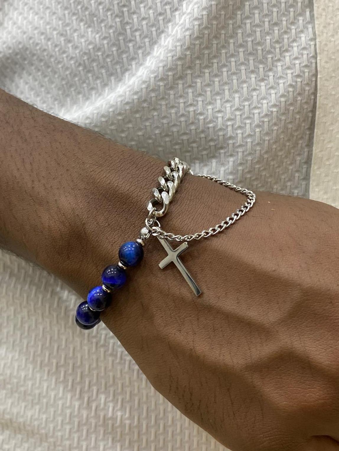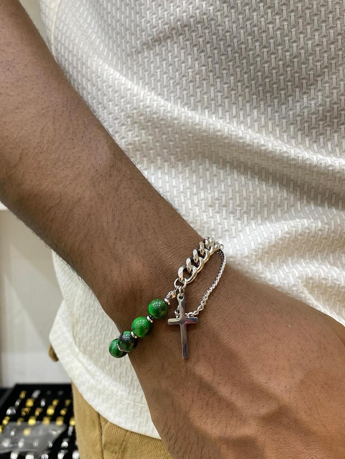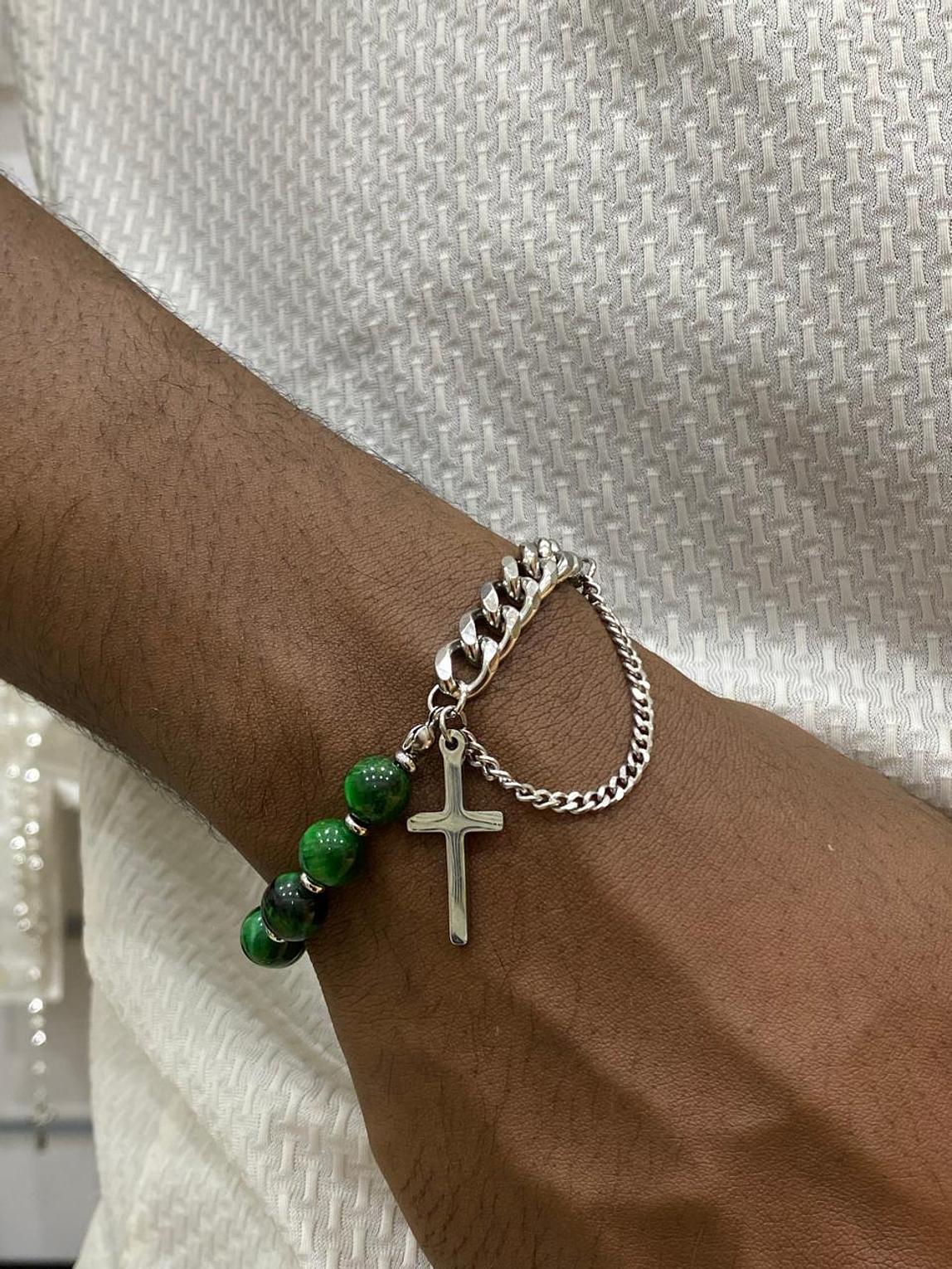 Express your spirit with the Faith & Form Bracelet, a dynamic accessory blending vibrant beads with a sleek chain and cross charm. Available in captivating blue or lush green, it adds a meaningful edge to your wrist.
