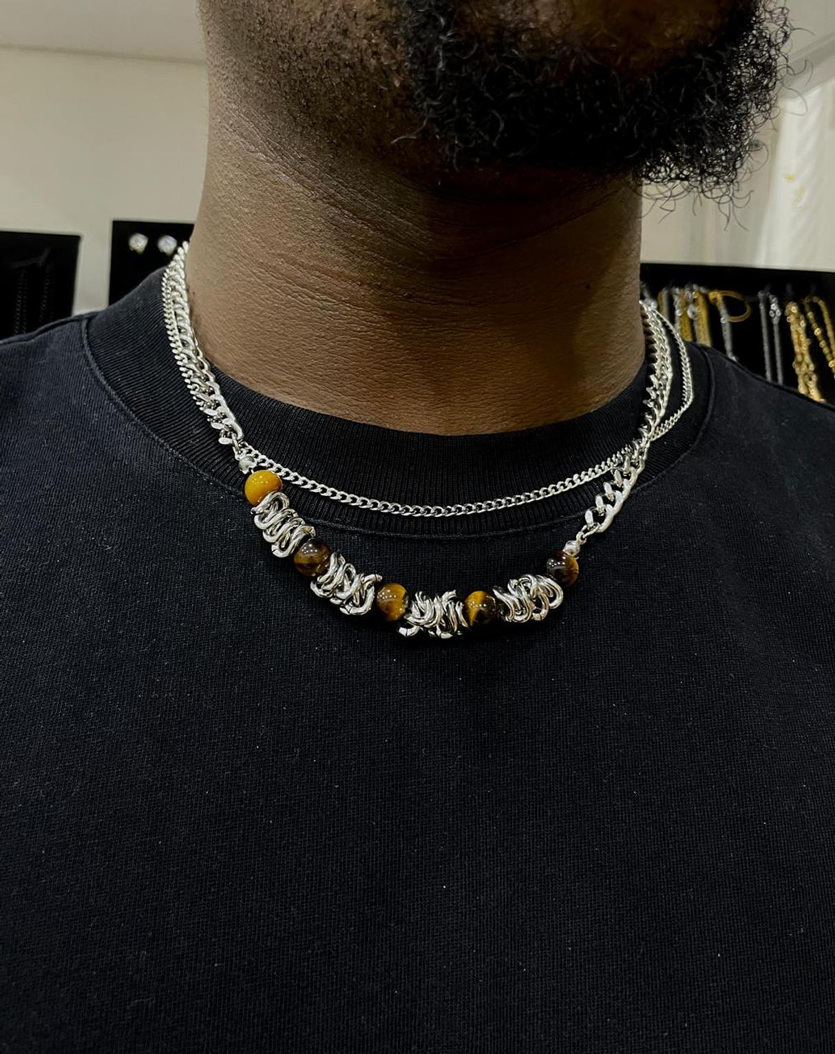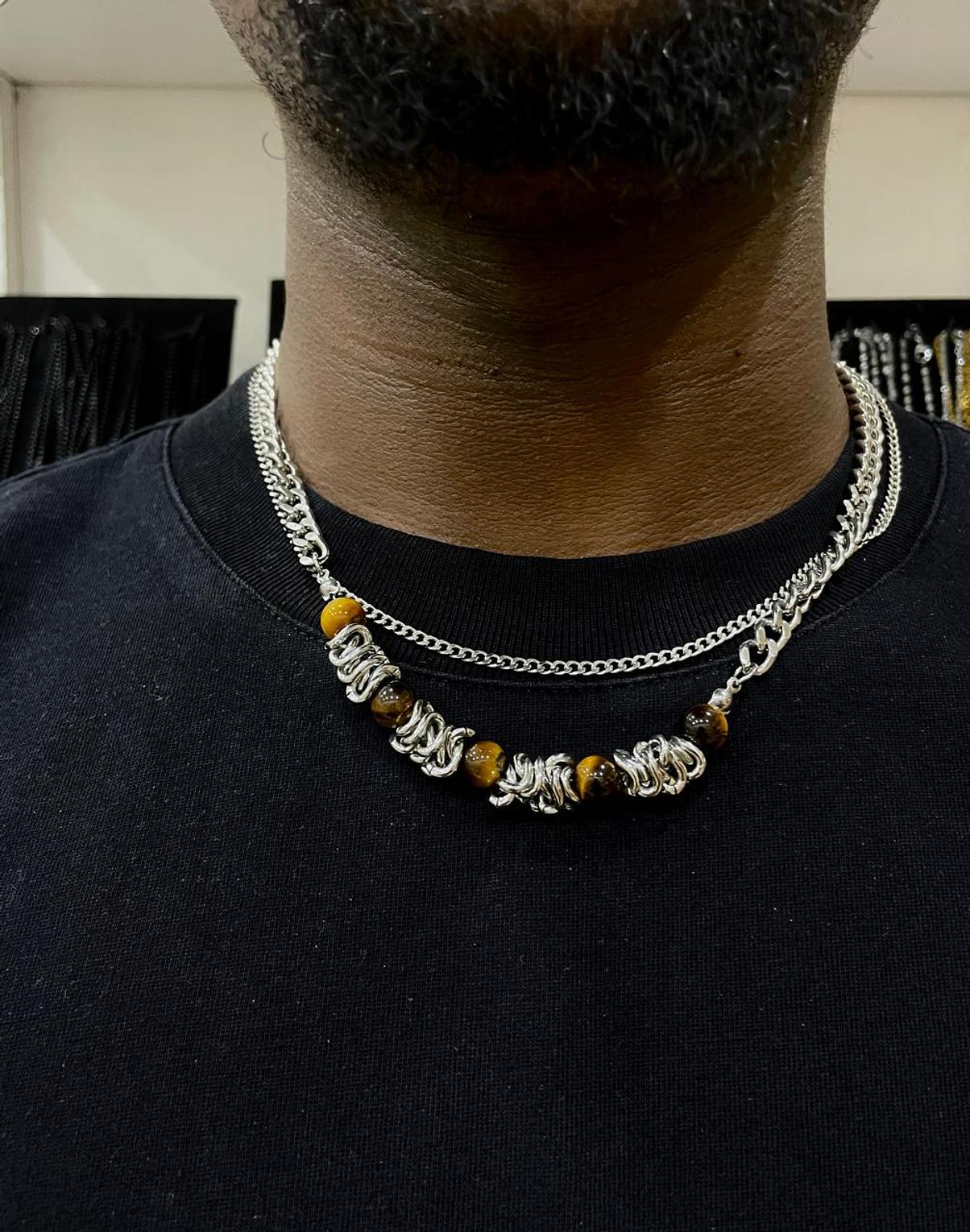 This bold dual-layer necklace combines sleek Cuban chain links with eye-catching decorative metal beads for a contemporary urban style. The layered design creates depth and dimension, making it perfect for those who want to make a statement.