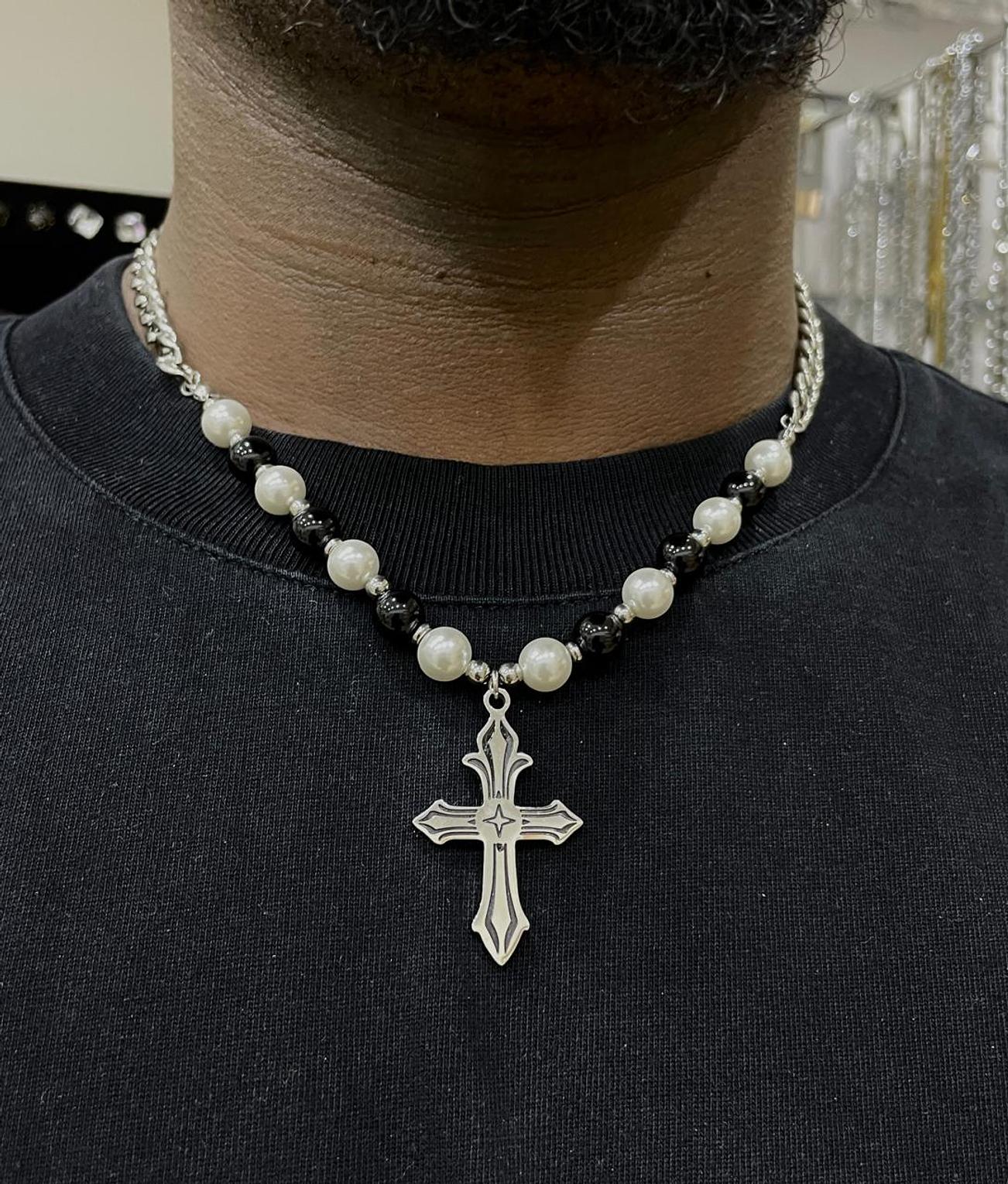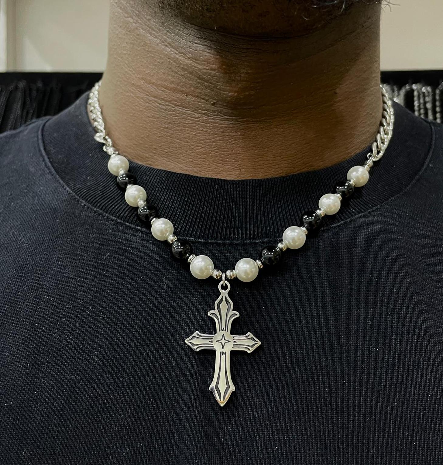 Unleash a bold statement with the Onyx & Pearl Cross Chain, featuring an alternating pattern of dark onyx and luminous pearls. This eye-catching piece culminates in a striking cross pendant, blending contrasting elements for a powerful look.