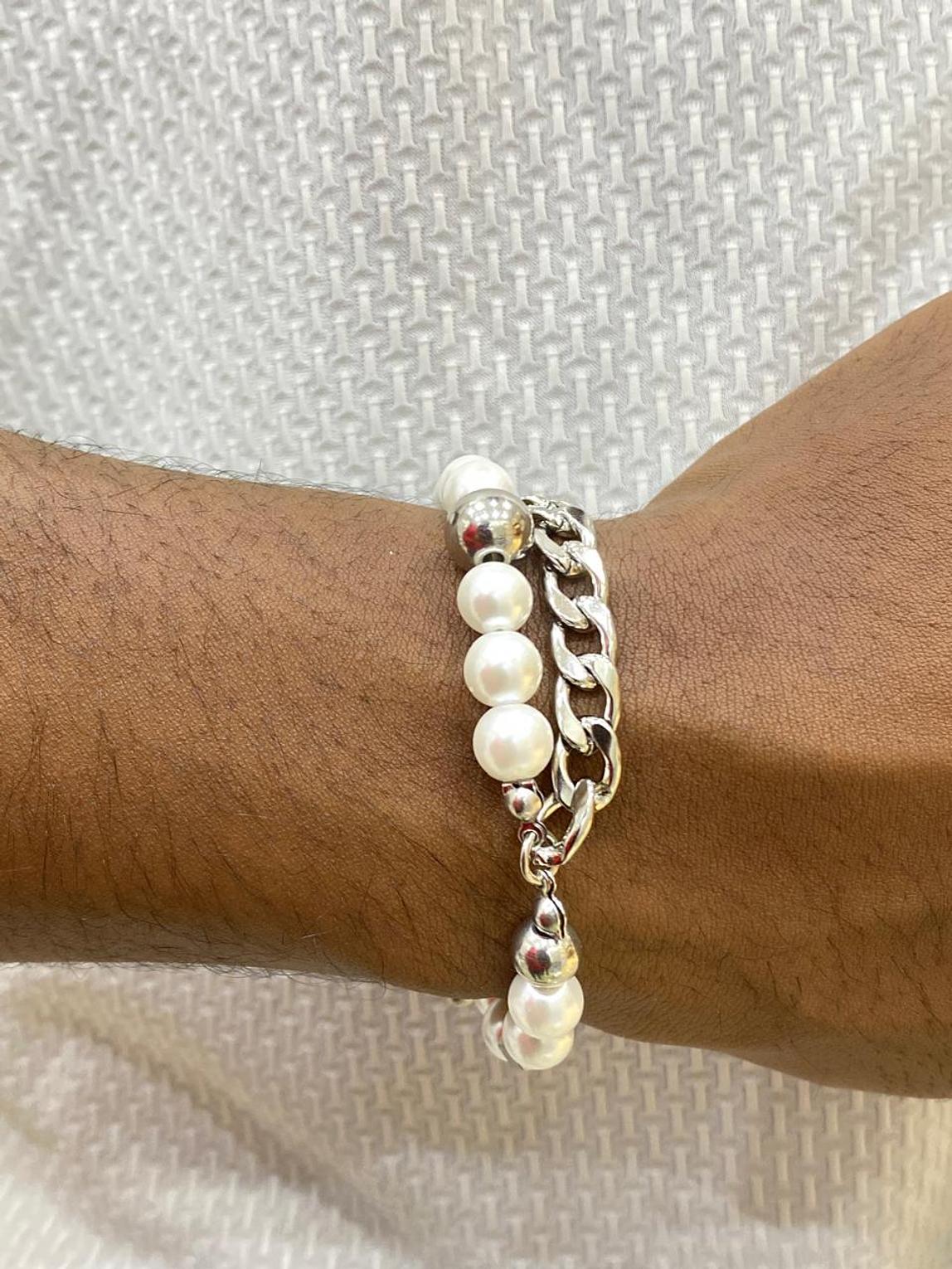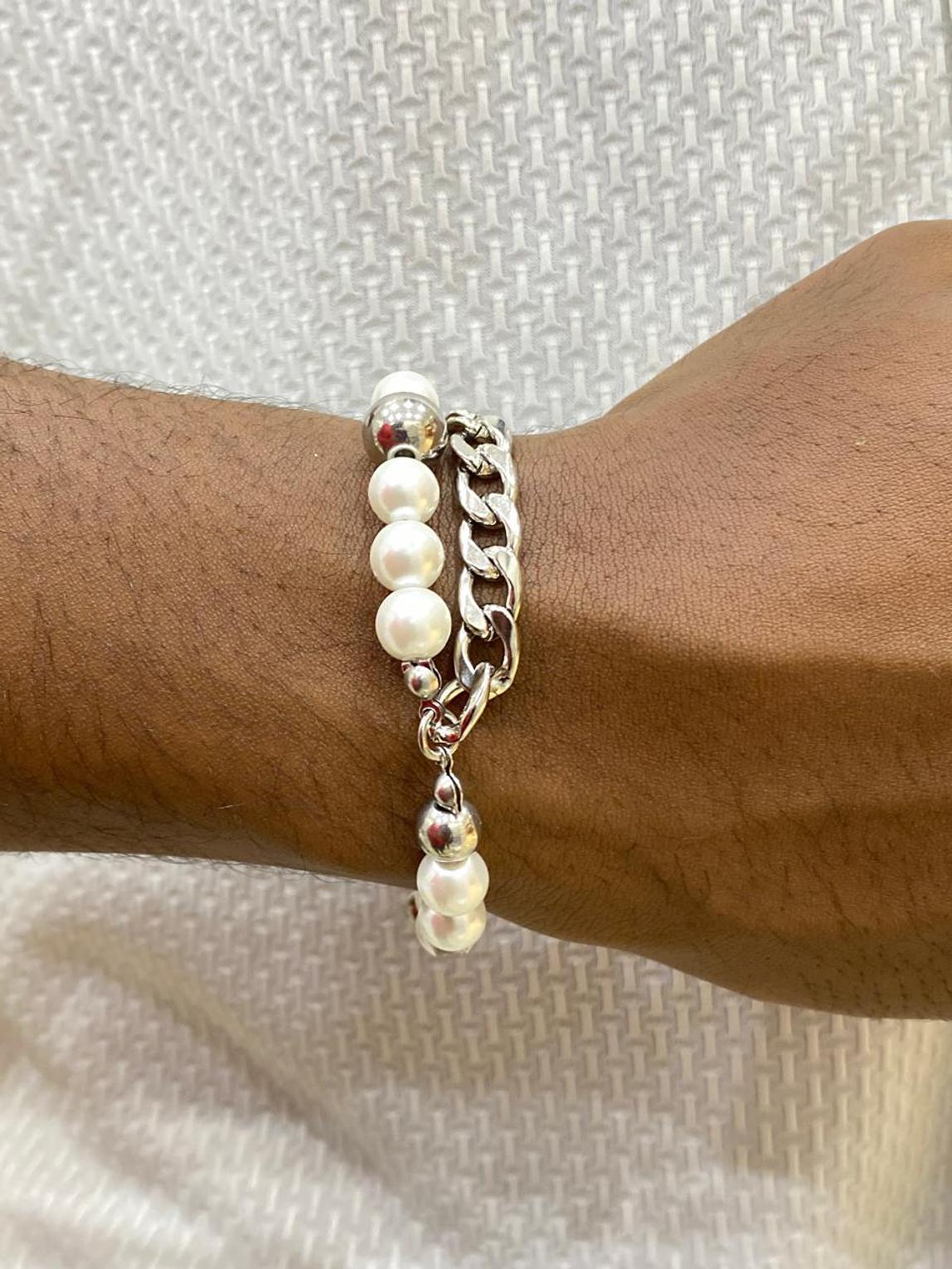 Embrace a sophisticated blend of classic elegance and modern edge with the Pearl & Chain Fusion Bracelet. This unique piece combines lustrous pearls with a bold silver-tone chain for a captivating wrist statement.