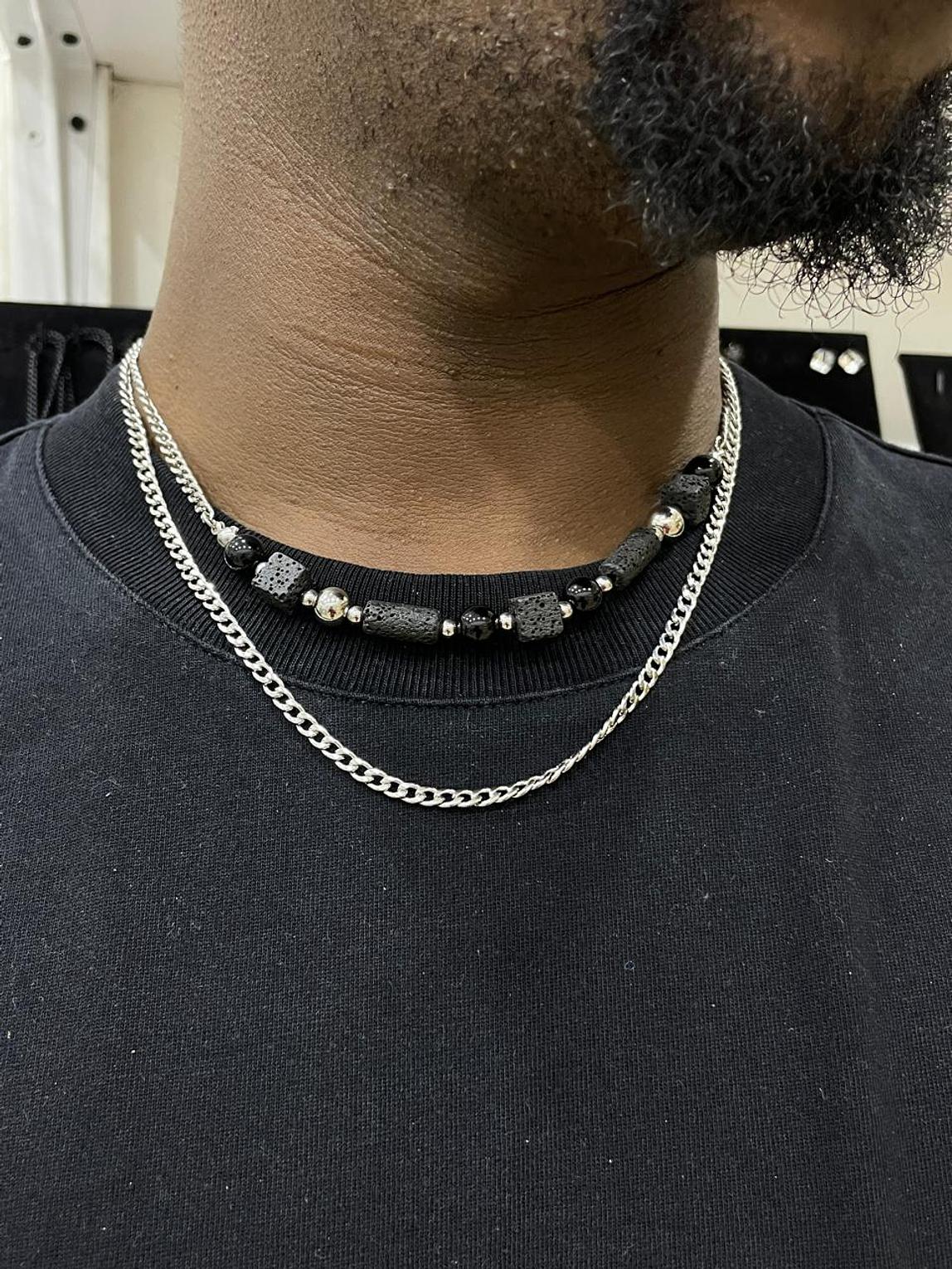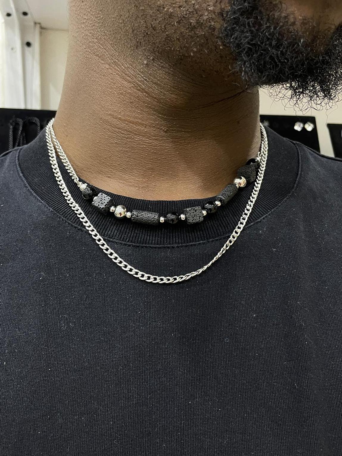 Embrace a fusion of raw texture and sleek shine with the Volcanic Edge Layered Chain, featuring natural black lava beads paired with a classic chain. This duo offers a modern, rugged elegance for any look.